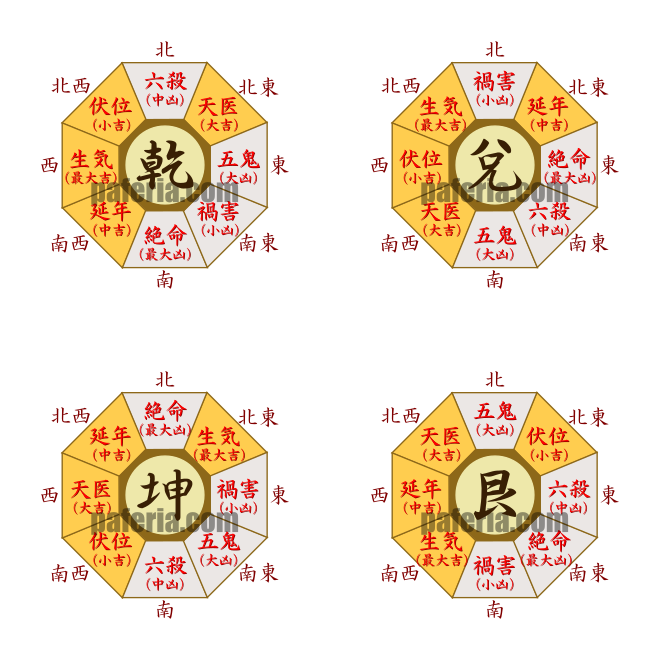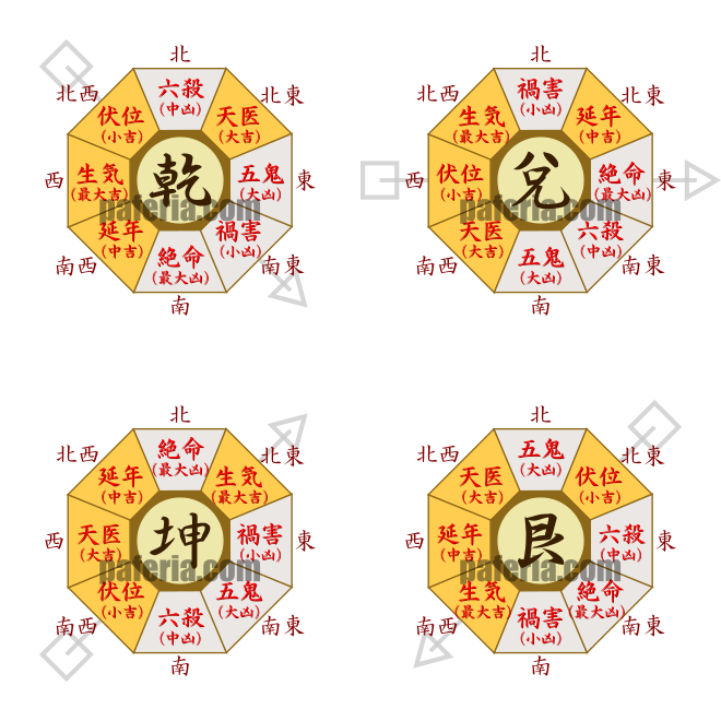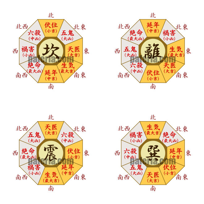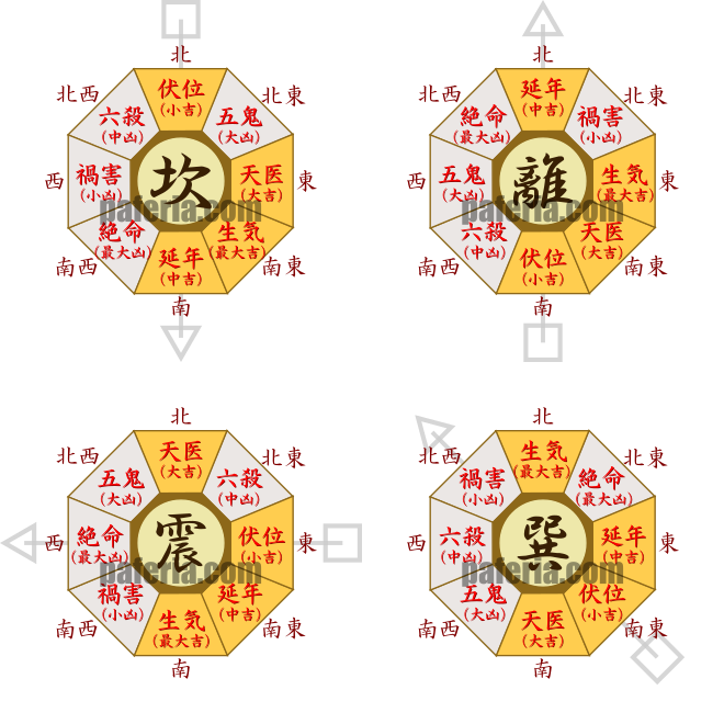 そのなかで、吉方位が東側に集まっているグループ(坎・離・震・巽)を東四命(とうしめい)、西側に集まっているグループ(乾・兌・坤・艮)を西四命(さいしめい)と呼びます。